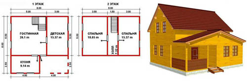 Главное достоинство, которым характеризуется дом 8х8 из профилированного бруса, заключается в том, что он подходит для любого проживания: как круглогодичного, так и летнего. В общем случае строение представляет собой просторный домик, который можно возвести практически на любом участке земли. Даже на самом маленьком. Как правило, планировка его — идеальна. Вообще, строения данного типа представляют собой идеальное решение для семьи с двумя-тремя детьми.