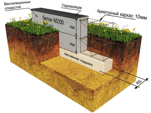Грамотное строительство дома из бруса камерной сушки подразумевает обустройство специального основания. Зачастую это мелкозаглубленный ленточный фундамент.